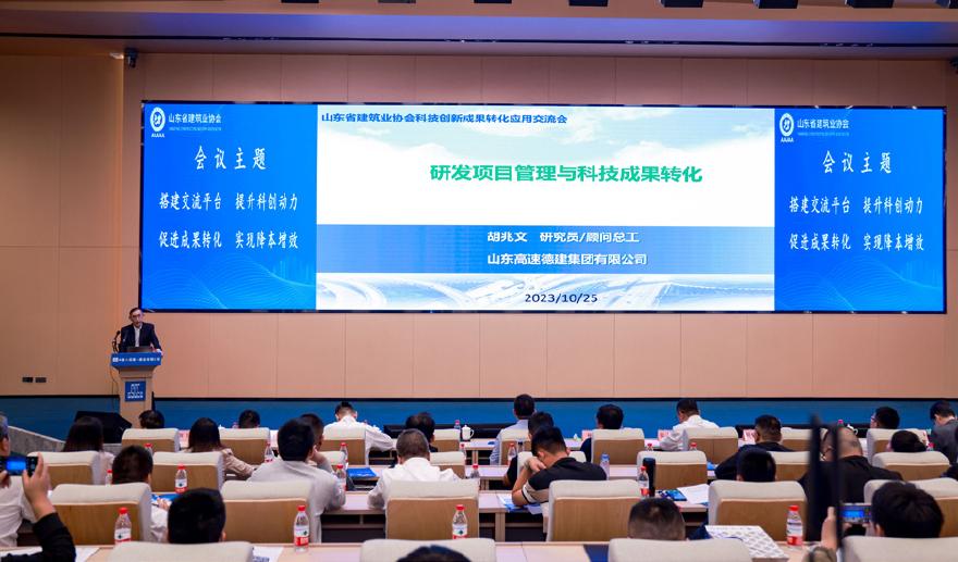 10月25日至26日 由山东省建筑业协会主办的山东省第一届科技创新成果转化应用推介交流大会在济南中国建筑绿色产业园举办。山东省建筑业协会副会长兼秘书长林滨、副秘书长王琳,各地市建筑业协会代表、专家学者、企业代表等400余人出席本次大会。推介会上,公司顾问总工程师胡兆文对研发项目管理进行了全流程解析,并重点介绍了公司的科技成果转化情况。公司在本次科技成果推介会设置两个展位,以视频、展板、宣传册及研发人员现场讲解等形式对创新成果进行推广宣传。