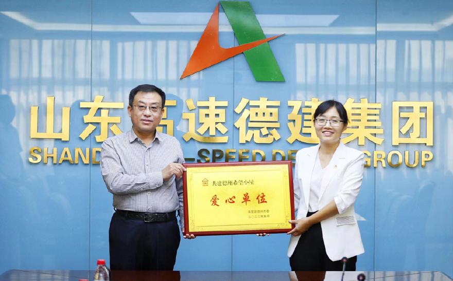 近日,共青团德州市委书记张方瑞,共青团德州市委四级调研员、统战部部长王云飞一行来公司调研,并颁发“共建德州希望小屋爱心单位”牌匾,并授予集团“共建德州希望小屋爱心单位”牌匾,以感谢高速德建在团市委希望小屋儿童关爱项目中作出的贡献。公司领导靳海洋、马志新、王香涛、王新勇及相关部室负责人参加活动。