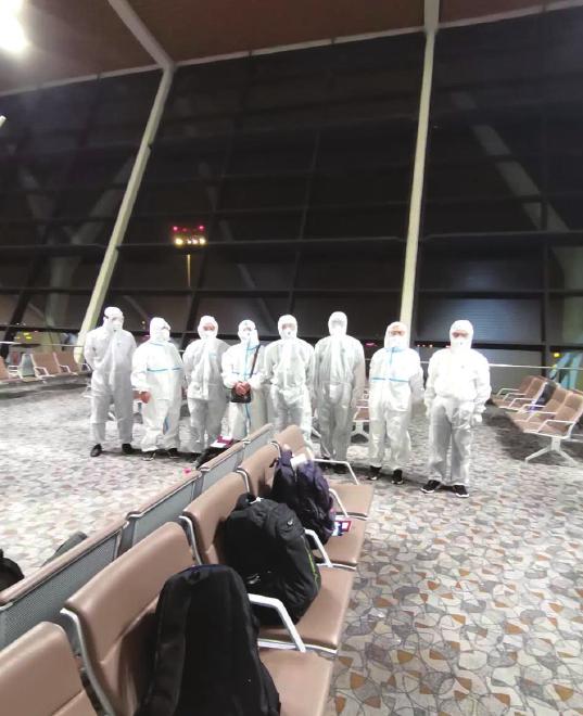 6月16日(左图)、23日(下图),德建国际一行26人赴坦桑尼亚公路项目工作。因非洲疫情严重,为防止交叉感染,公司为他们配备口罩、防护服、护目镜等防疫用品,他们也将在高温天气下持续21小时不进餐不饮水,在保障自身安全的同时,不将疫情带入坦桑、带入项目工地。