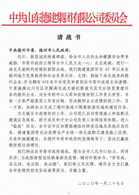①1月27日,集团公司党委向市委、市政府递交捐建防疫设施请战书