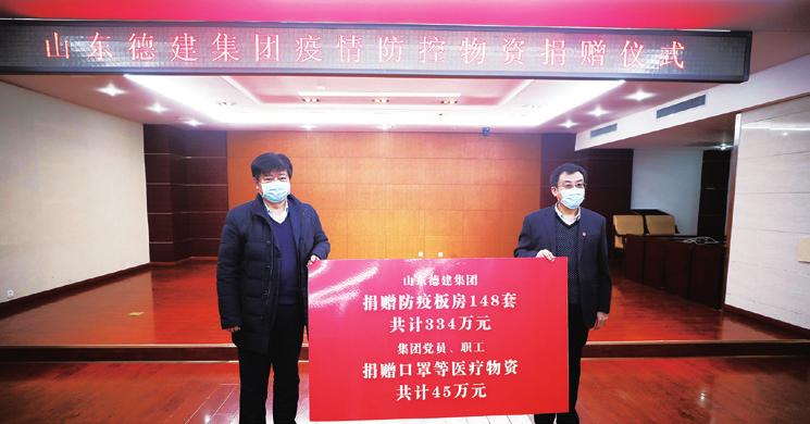新冠肺炎疫情爆发以来,1月25日至2月5日集团为全市捐建147套防疫设施,做到13个县市区全覆盖!1月27日,集团公司党委向市委、市政府递交捐建防疫设施的请战书,德州市委副书记、市长杨洪涛同志特别批示:“可作为后需力量,予以调动。”1月28日,集团公司通过企业公众号向社会发出无偿援助临时防疫设施及其他应急任务的公开信。1月31日,集团党委通过企业OA办公平台向全体党员和职工发出募捐倡议,10小时募捐善款40余万元,传递德建人大爱深情,为疫情防控作出贡献。