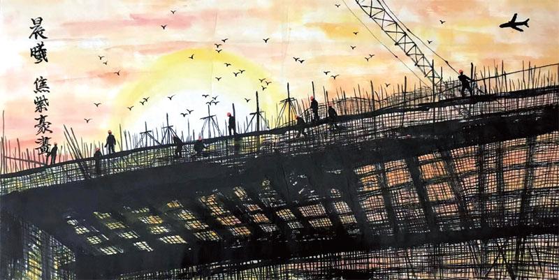作品灵感:来源于看到工人们迎着最早的阳光,各司其职,在阳光冉冉升起的那一刻,虽然看不清他们的样貌,但感觉平凡而伟大,以此画作敬之。