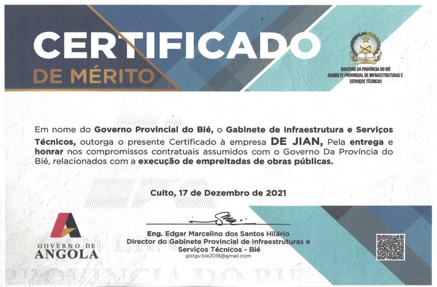 颁奖仪式上,比耶省省长贝雷拉·奥弗莱度代表省政府,对公司长期以来致力于当地基础设施建设,拉动当地建筑业整体水平提升表示真诚的感谢。他表示,当前严峻的疫情形势下,德建国际安哥拉分公司能够严格按照合同履约,保证质量和速度,如期交付每一项工程,成功树立起了有责任、有担当的中国企业形象。